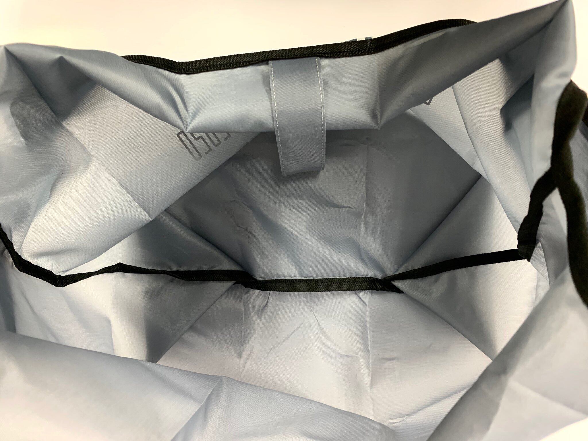 "パイピングで補強されていて、強度が高い。大判ロゴ入り。"